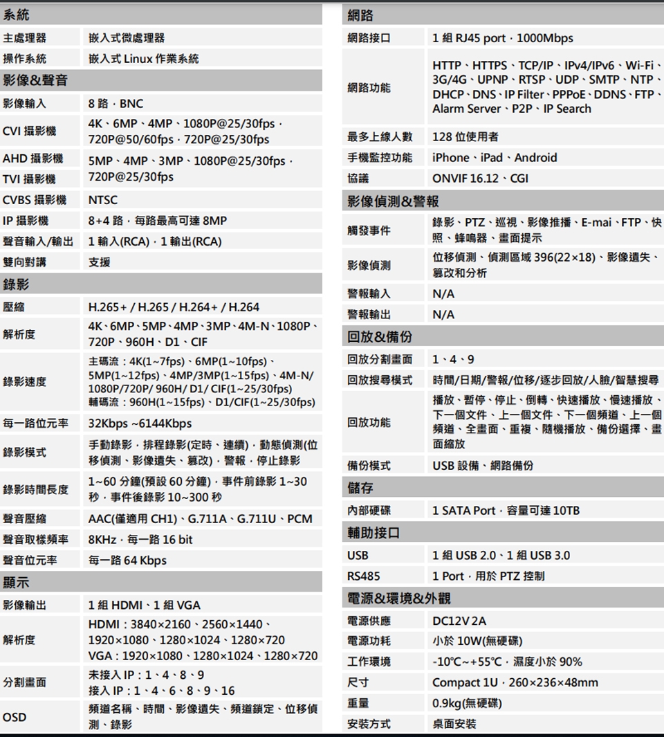 支援 CVI、AHD、TVI、CVBS、IP 影像訊號輸入