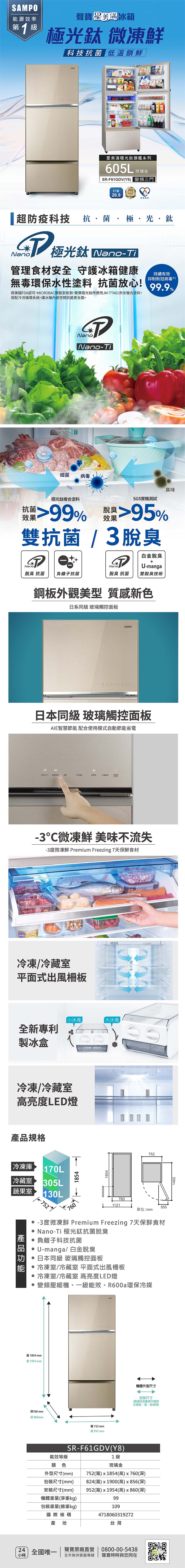 ◆冷凍室容量:170公升, 冷藏室容量:305公升,蔬果室:130公升