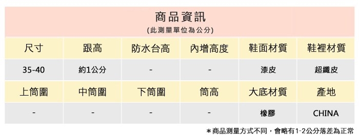 2.鞋類商品依功能及用途之不同,鞋底各有其止滑係數之個別不同,使用鞋類商品請用於正常平坦之路面,非雨鞋或雨靴類商品,請避免穿著於下雨濕滑路面上行走。