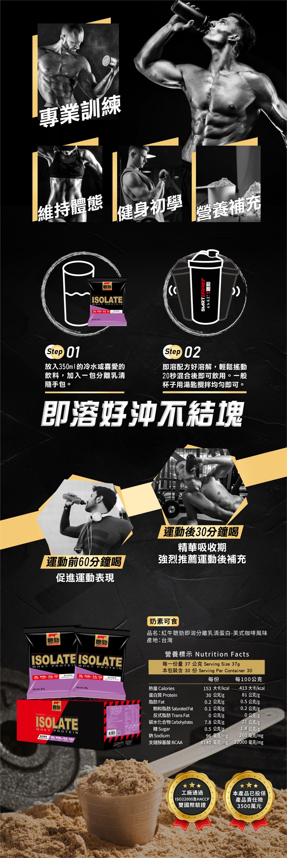 將1包(約37g)分離乳清加入350ml冷水,混合後即可飲用