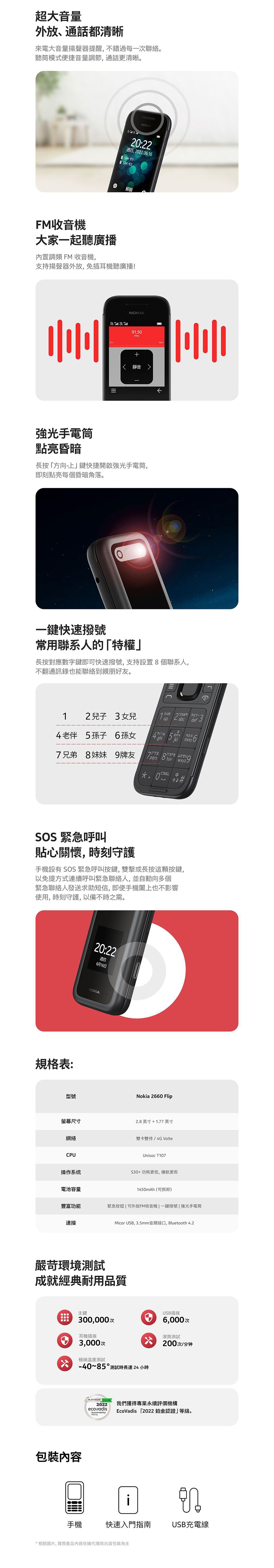功能:緊急按鈕|可外放FM收音機|一鍵撥號|強光手電筒