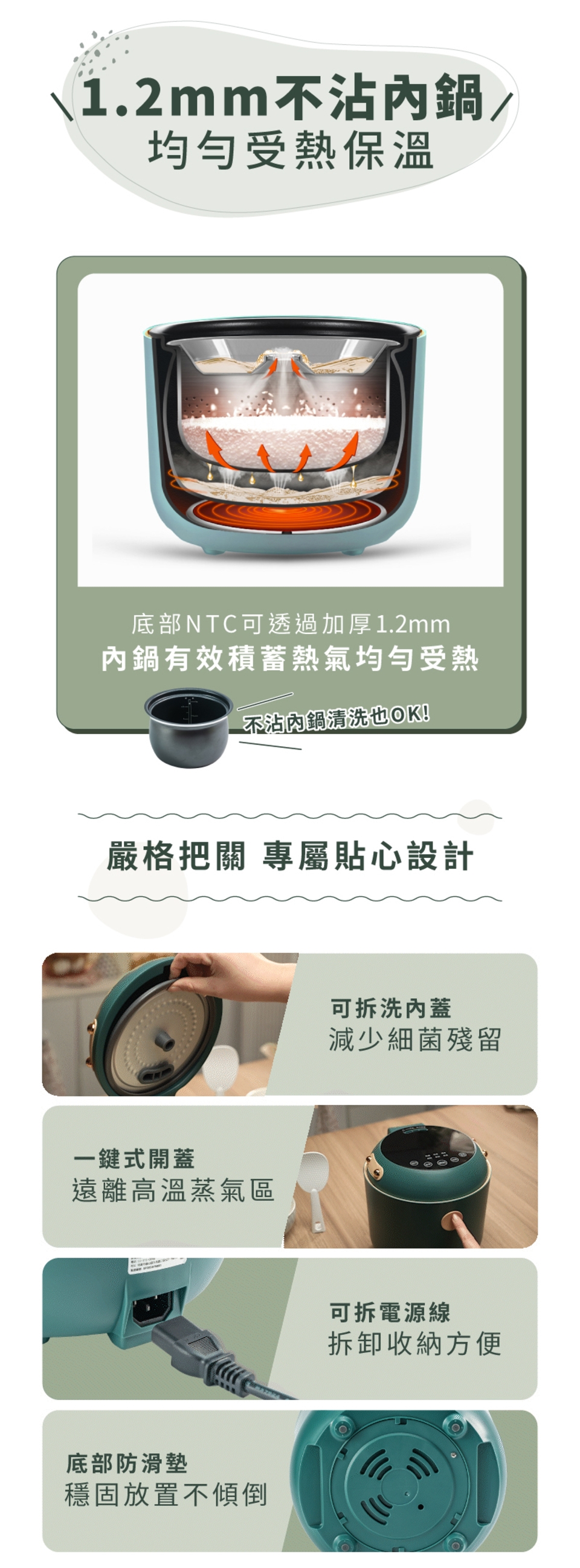 2 公升輕巧體積,每餐可烹煮 1~4 杯米飯,剛剛好的份量,小家庭也能輕鬆開伙。
