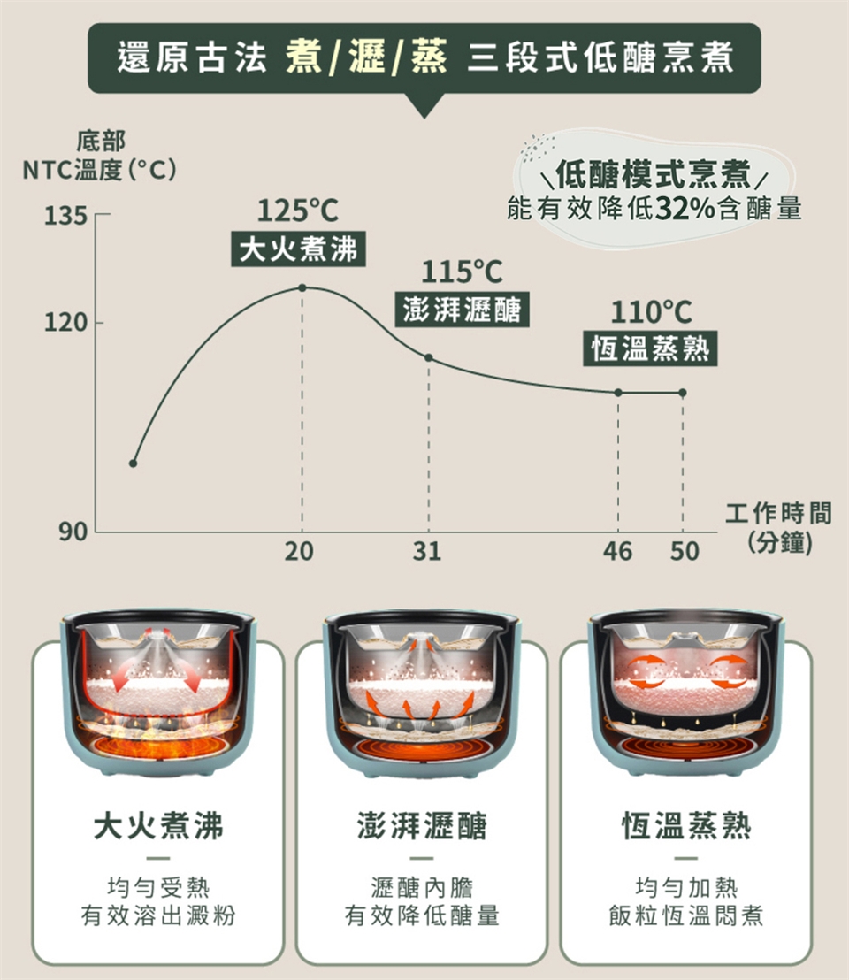 用現代技術還原古法工藝,煮、瀝、蒸三步驟,烹煮時能完美釋放醣質,可將含有醣質的水分輕鬆排除,與一般米飯相比,可以減少約 1/3 的醣份。