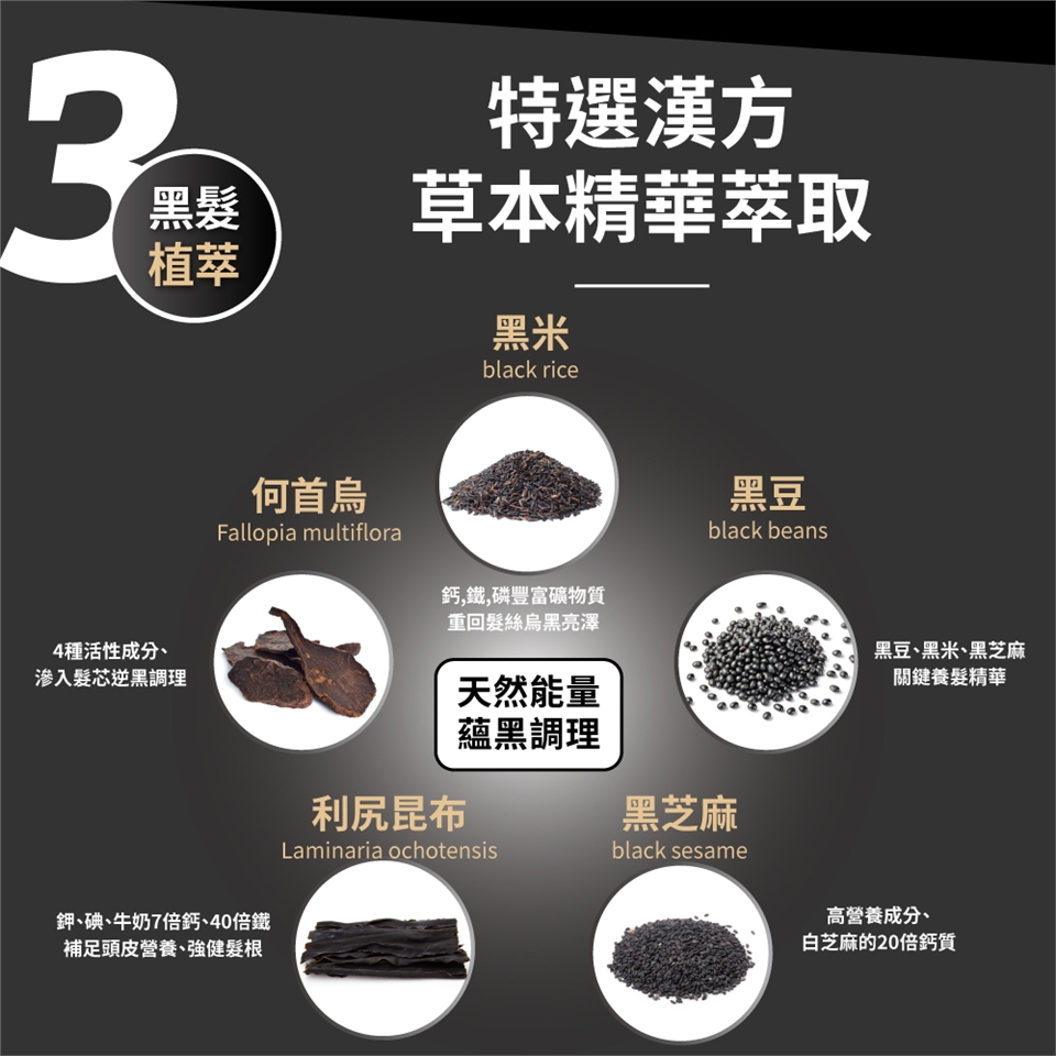 3.特選漢方草本精華:牛奶7倍鈣、40倍鐵補足頭皮營養、4種活性成分何首烏、鈣鐵磷豐富礦物質重回烏黑亮澤。