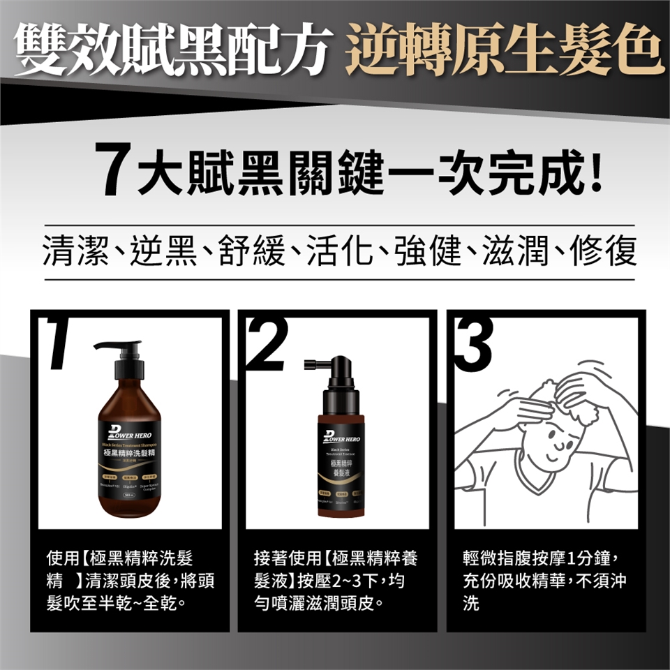 Q:PowerHero®的【極黑精粹洗髮精】如何搭配【極黑精粹養髮液】?