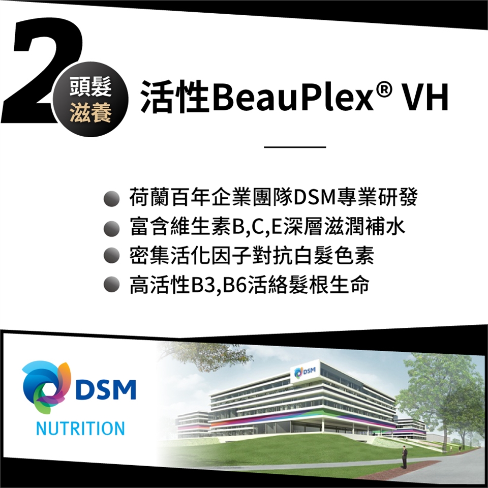 2.活性BeauPlex® VH :荷蘭百年團隊DSM專業研發、富含維生素B,C,E深層滋潤、高活性B3,B6活絡髮根生命。