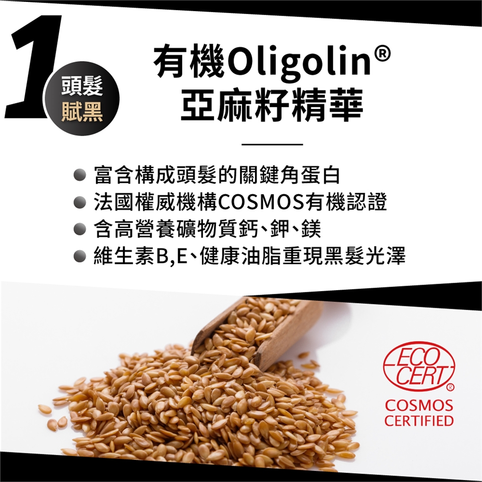 1.有機Oligolin®亞麻籽精華:法國權威機構COSMOS有機認證、高營養礦物質鈣鉀鎂、健康油脂重現黑髮光澤。