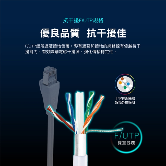 ◎FUTP外層鋁箔接地包覆,抗電磁干擾