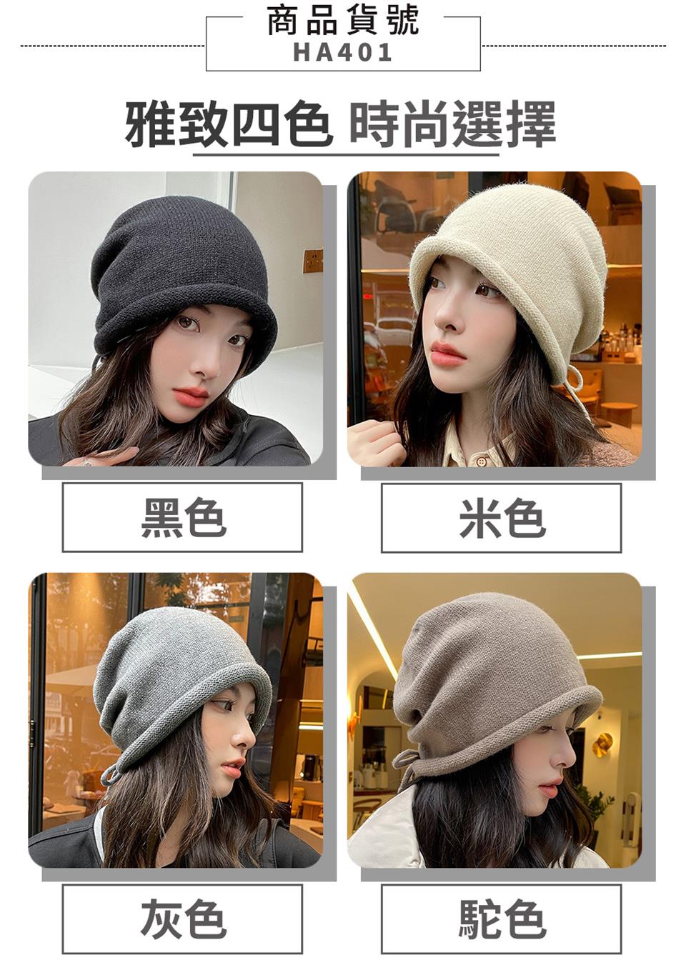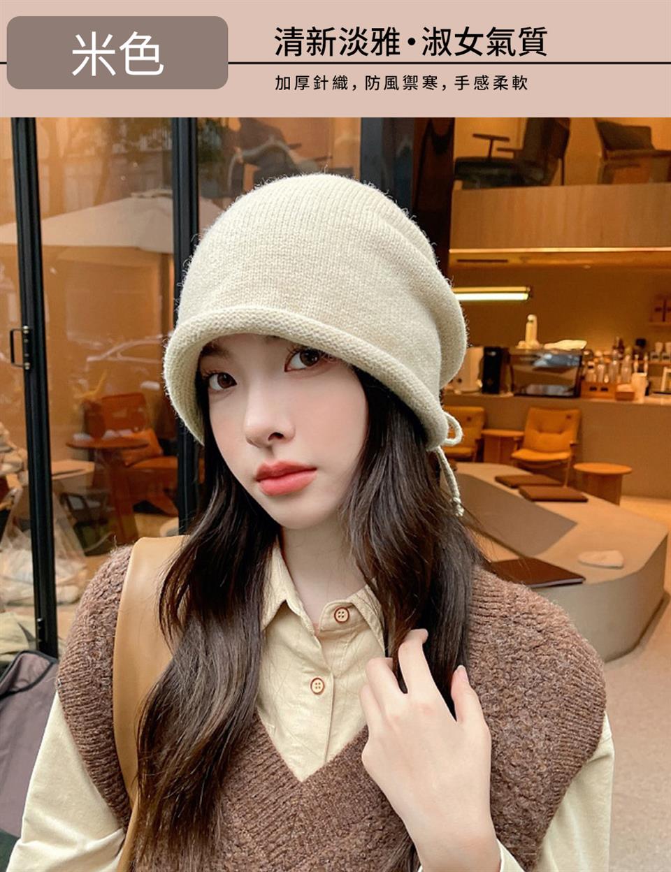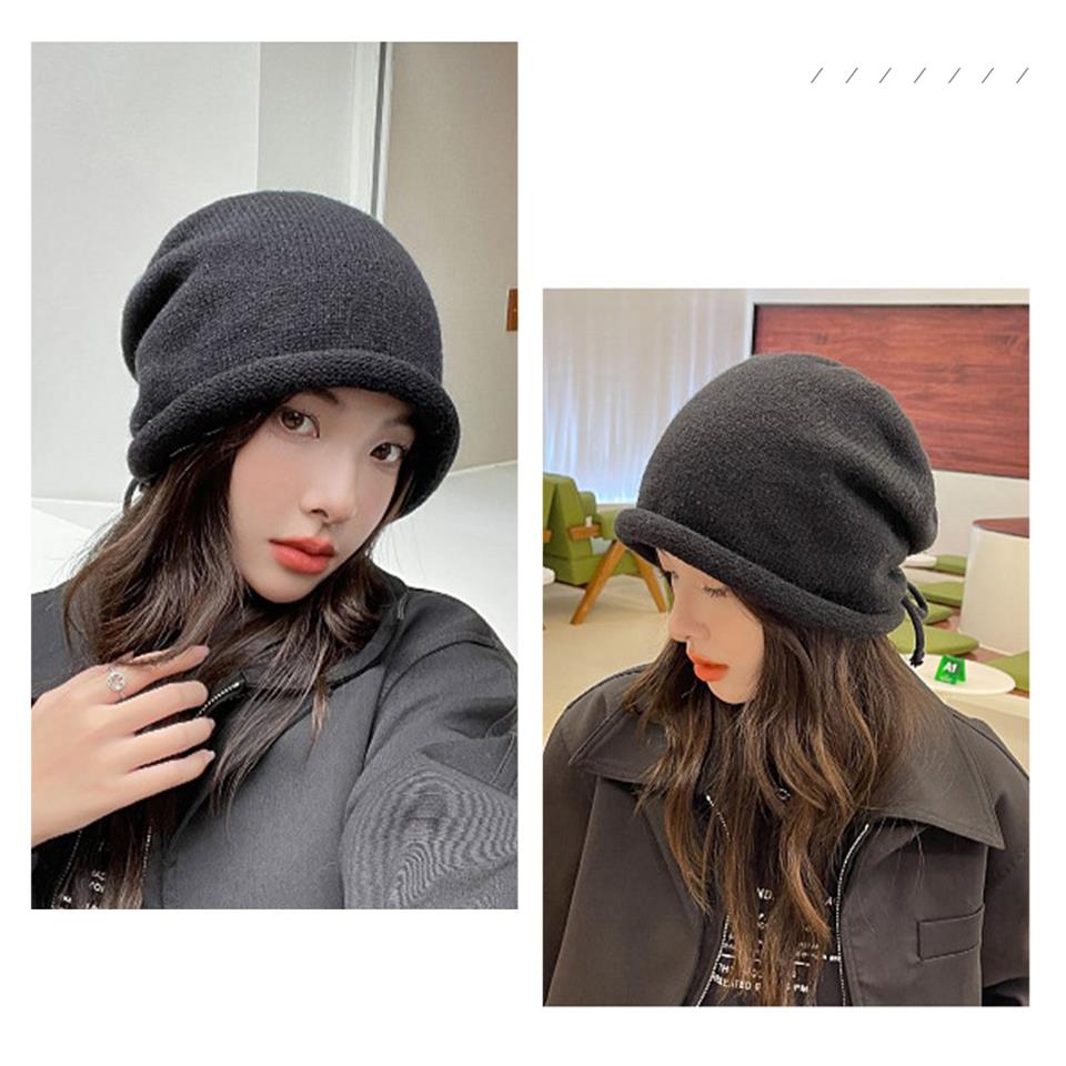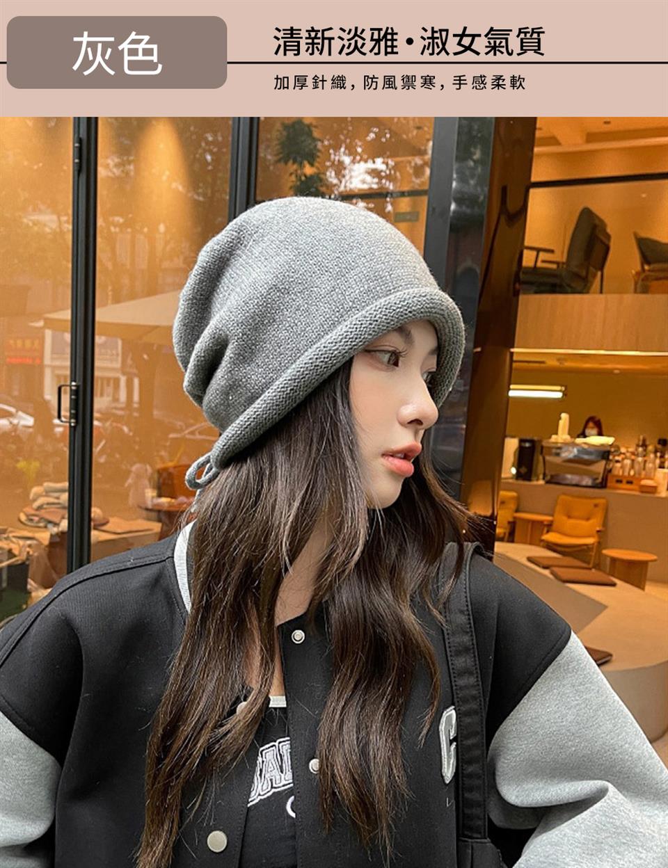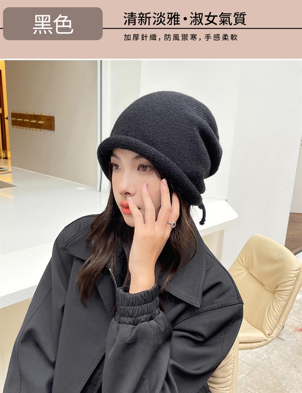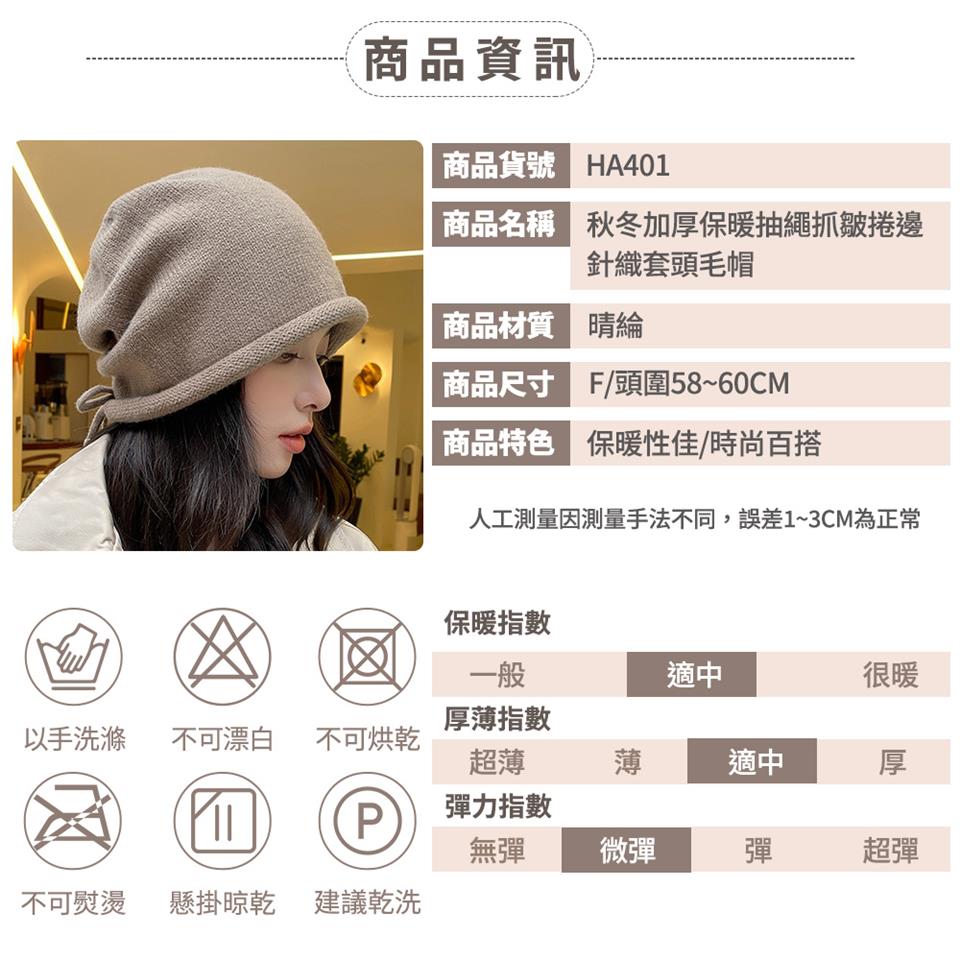 秋冬加厚保暖抽繩抓皺捲邊針織套頭毛帽