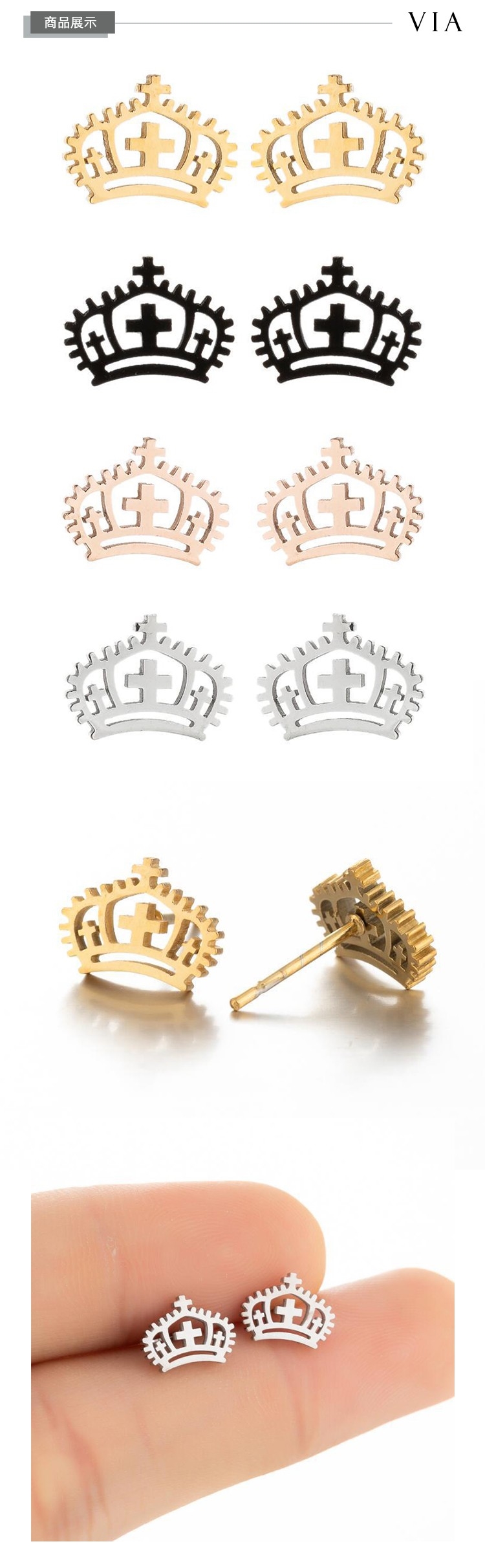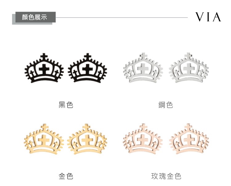 【VIA】時尚系列 十字架皇冠造型白鋼耳釘 造型耳釘 鋼色