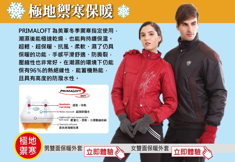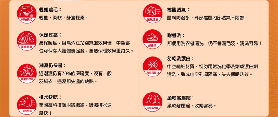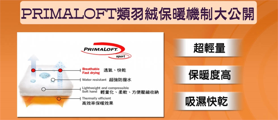 遇潮濕仍有70%的保暖度,不同於一般羽絨衣,遇濕即失溫的缺點。