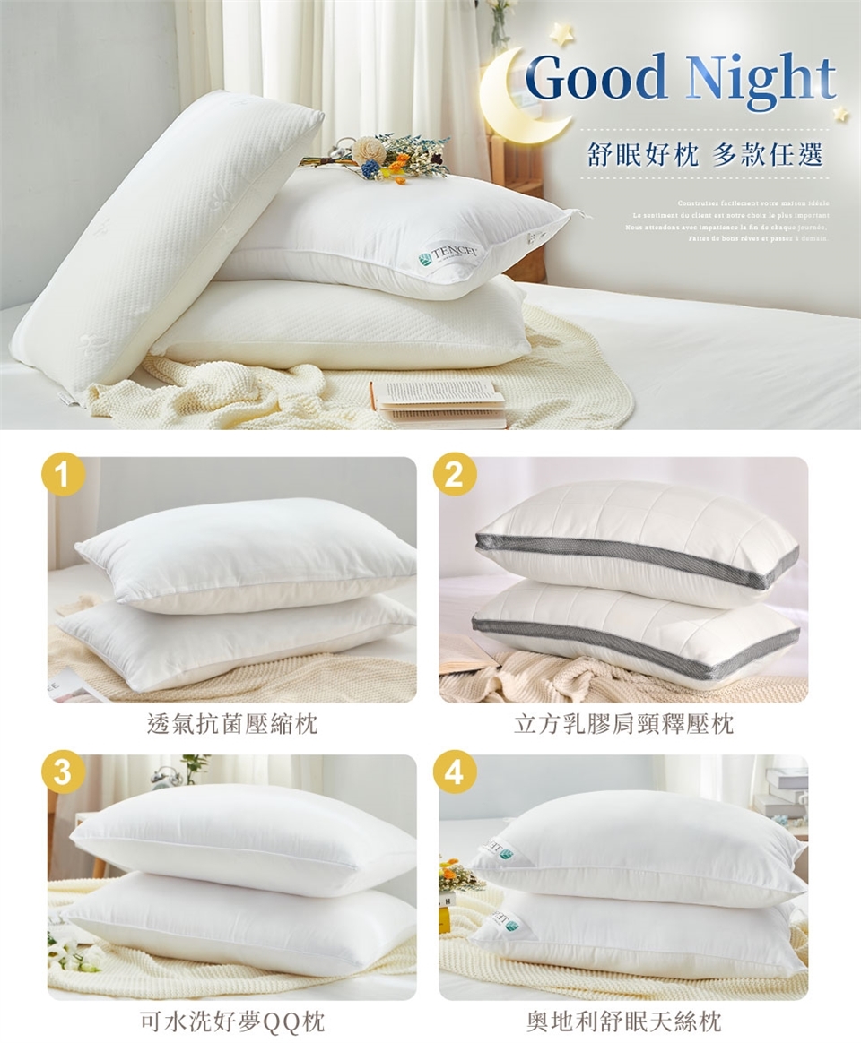 6.奧地利舒眠天絲枕:40度以下溫和洗滌/可乾洗/不可烘乾/不可漂白/不可熨燙