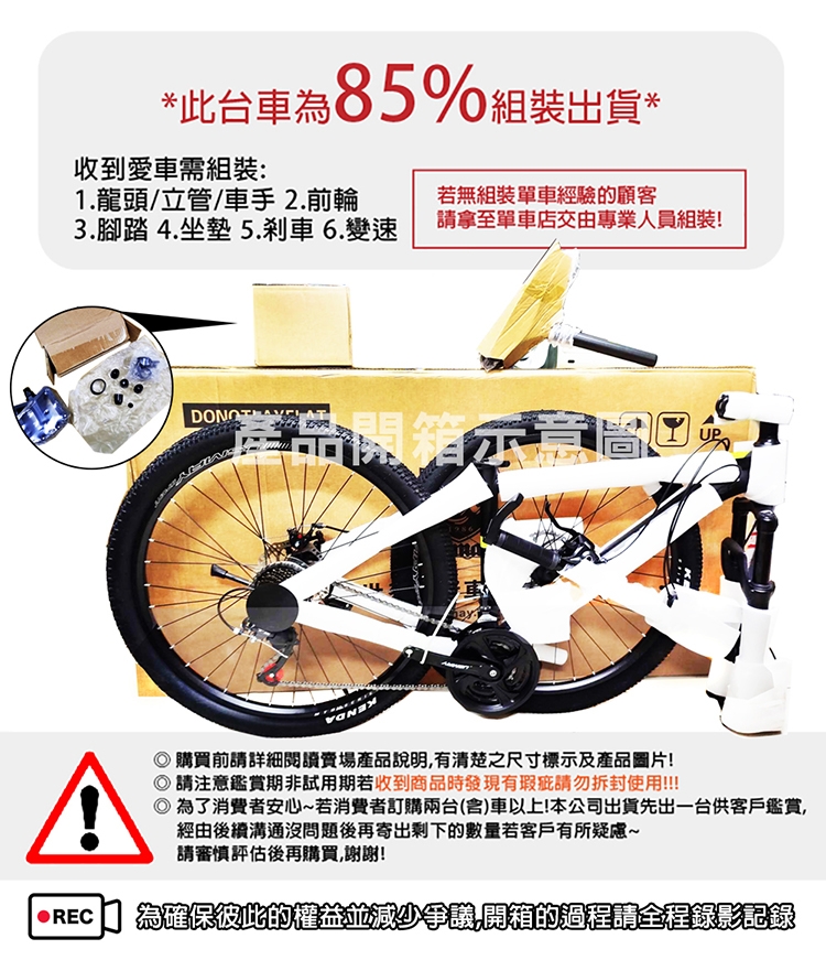 ● 此台車為85%組裝出貨,若沒有組裝單車經驗的顧客,請將車拿至車店交由專業人員組裝!