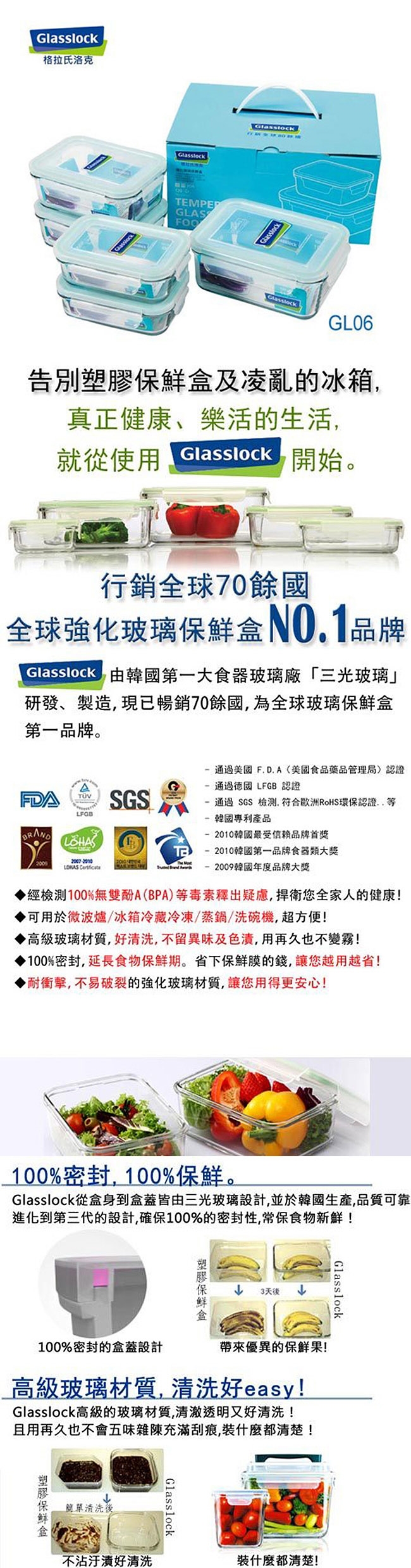 韓國Glasslock 5件式強化玻璃微波保鮮盒組(400ml*2+715ml*2+1100ml) GL06 韓國製