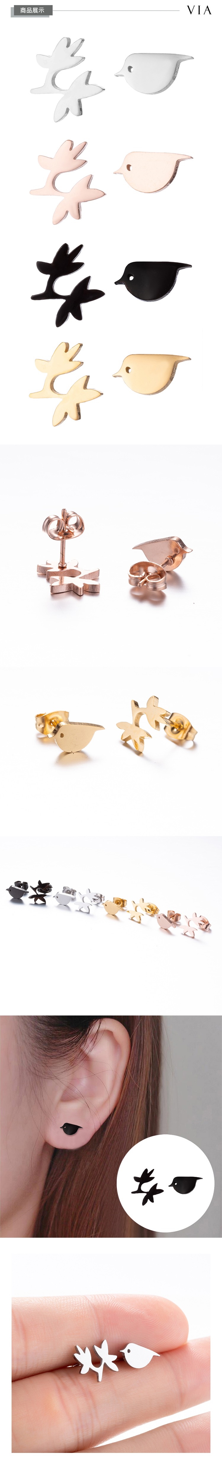 【VIA】動物系列 鳥與枝頭不對稱造型白鋼耳釘 造型耳釘 鋼色