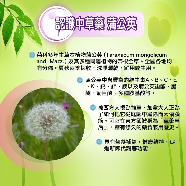 在東方被稱為「草藥皇后」的蒲公英,擁有悠久的藥食兼用歷史,蒲公英含豐富的維生素A、B、C、E、K、鈣、鉀、鎂以及蒲公英甾醇、膽鹼、菊巨酸、多種胺基酸等,具有營養補給,健康維持,促進新陳代謝等功能。