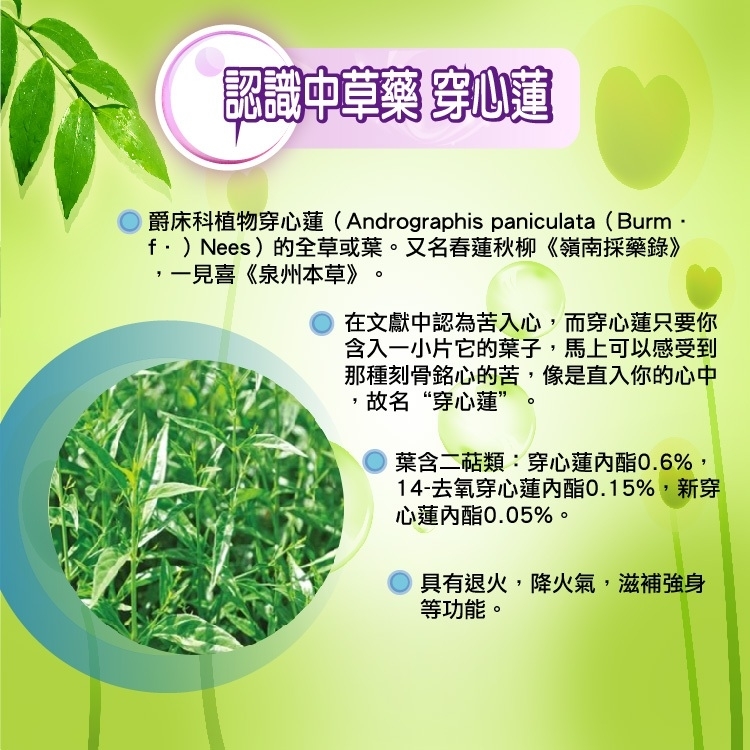 苦入心是穿心蓮特有的,只要你含入一小片它的葉子,馬上可以感受到,那種刻骨銘心的苦,像是直入你的心中,故名“穿心蓮”,在許多研究文獻中,穿心蓮具有很多生理功效,具有退火,降火氣,滋補強身等功能。
