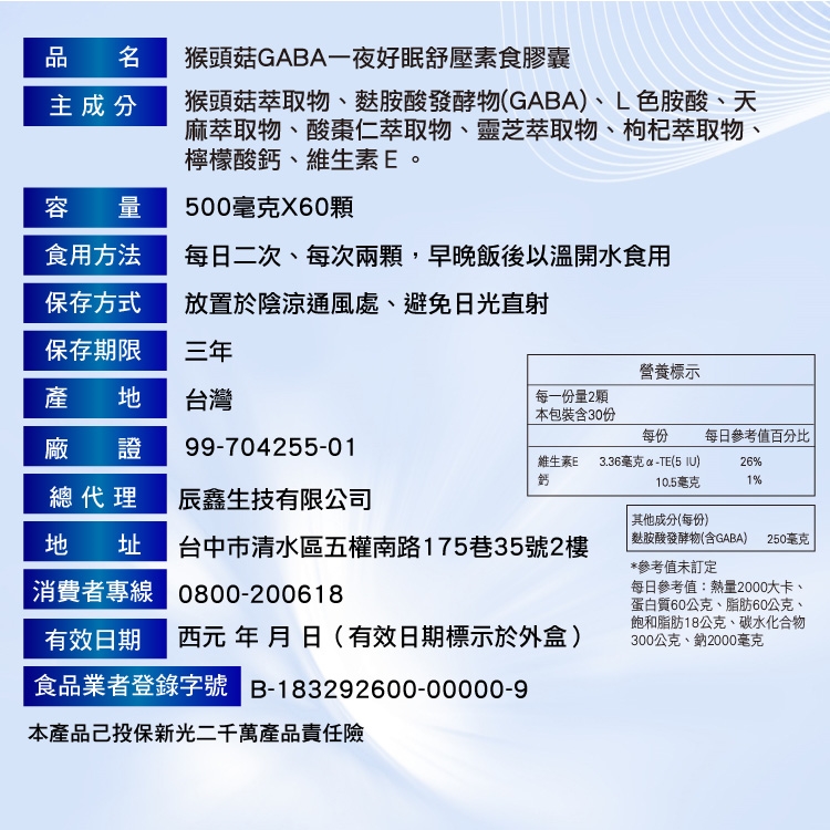 本產品精粹猴頭菇精華,含豐富猴頭素及猴頭酮,搭配日本專利及商標授權高品質GABA、L-色胺酸、酸棗仁獨家好眠配方為主體,可有效幫助入睡,提升睡眠品質,同時複合天麻萃取物、靈芝萃取物、枸杞萃取物等專家配方,彼此之間具有互補及協同作用,是重拾健康睡眠,讓您一夜好眠的精品!!
