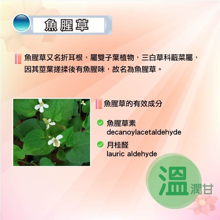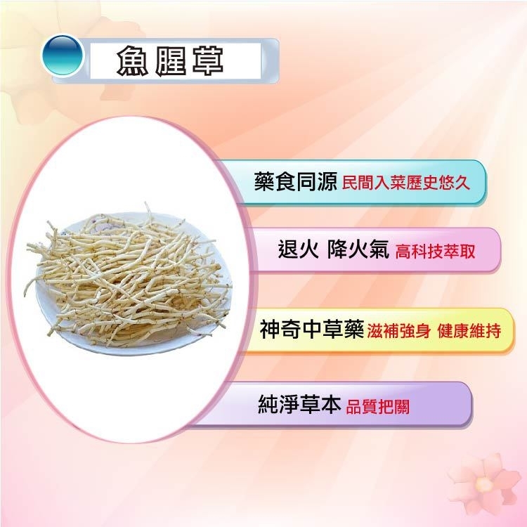 魚腥草(學名:Houttuynia cordata),又名折耳根,客家話稱之狗貼耳,臭嗟草(台語),因其莖葉搓揉後,帶有魚腥味,所以被稱為魚腥草。現代研究發現其特殊氣味主要來自於魚腥草中揮髮油中的一種有效成分-魚腥草素。魚腥草有"藥食同源"的特點,也就是說魚腥草不僅可以作為中草藥服用,也是可以作為菜餚的普通食材,透過高科技萃取技術,萃取魚腥草精華成分,具有退火、降火氣、調節生理機能、調整體質等效果。