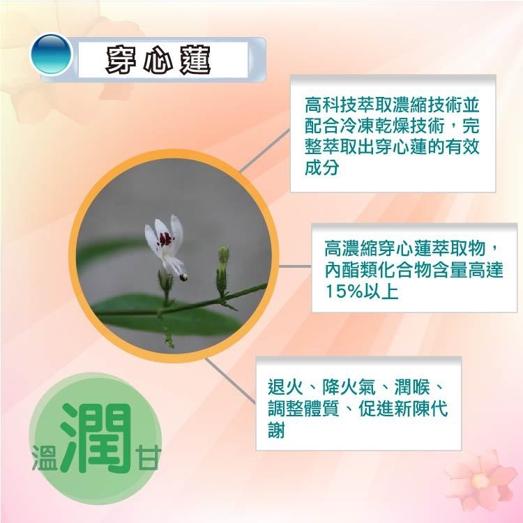 穿心蓮又名金香草、一見喜、苦心蓮,是民間常用的中草藥,也是青草茶中苦茶的主要成分之ㄧ。穿心蓮內含的有效成分為內酯類化合物,內酯含量的多寡決定了產品的品質,本產品透過高科技萃取濃縮技術並配合冷凍乾燥技術,完整萃取出穿心蓮的有效成分,其中穿心蓮內酯(Andrographolide)含量高達15%以上,可達到退火、降火氣、調整體質、促進新陳代謝、潤喉的保健目的,是純天然的保健食品。