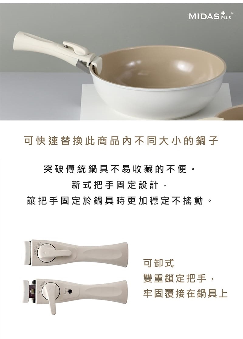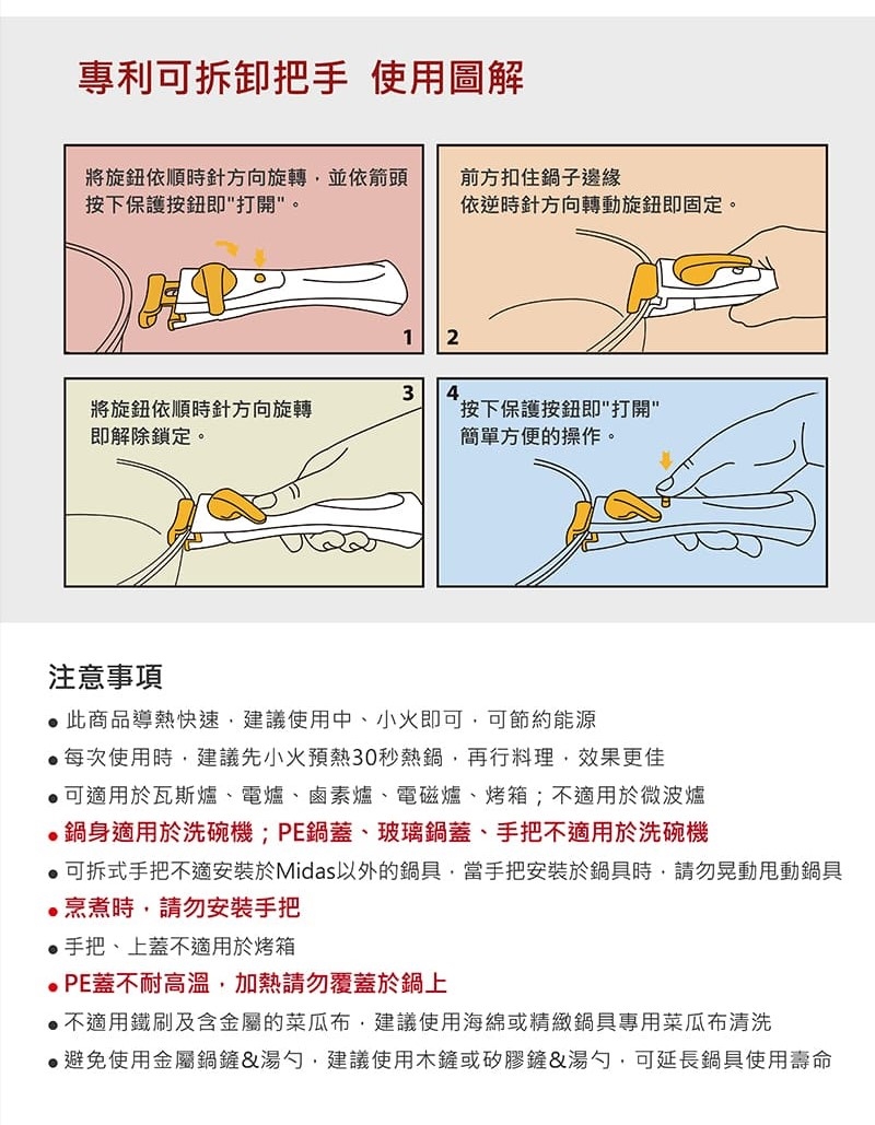 ●可拆式手把不適安裝於Midas以外的鍋具