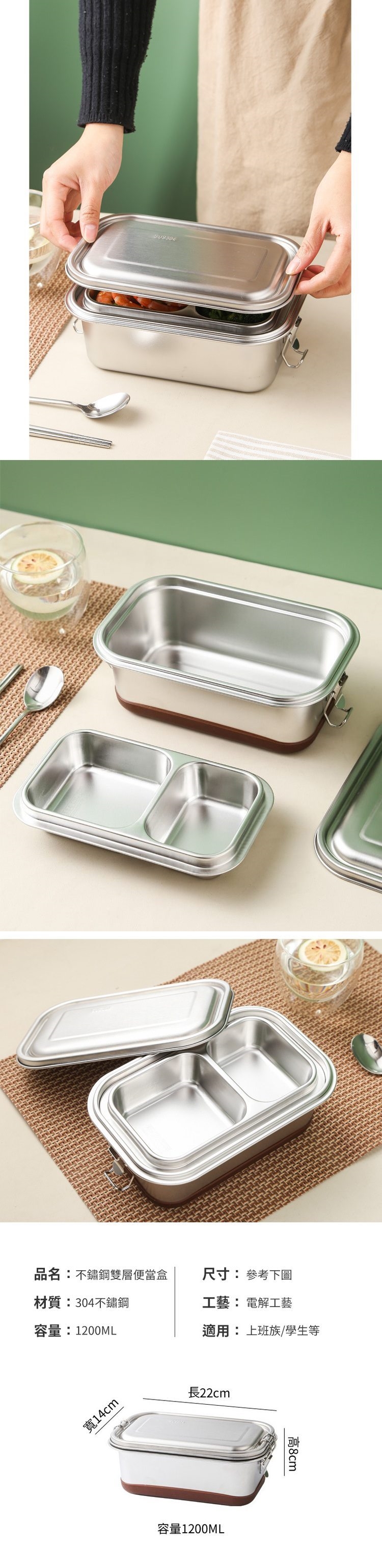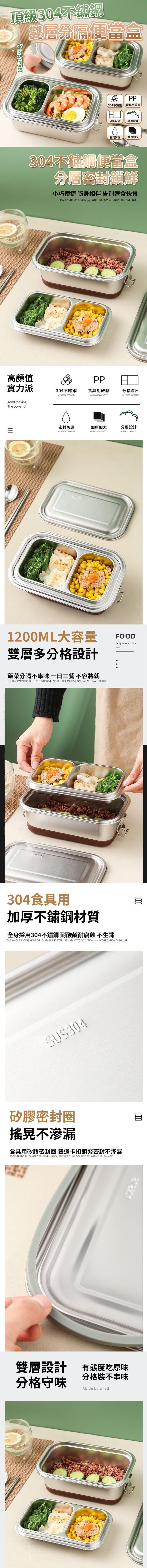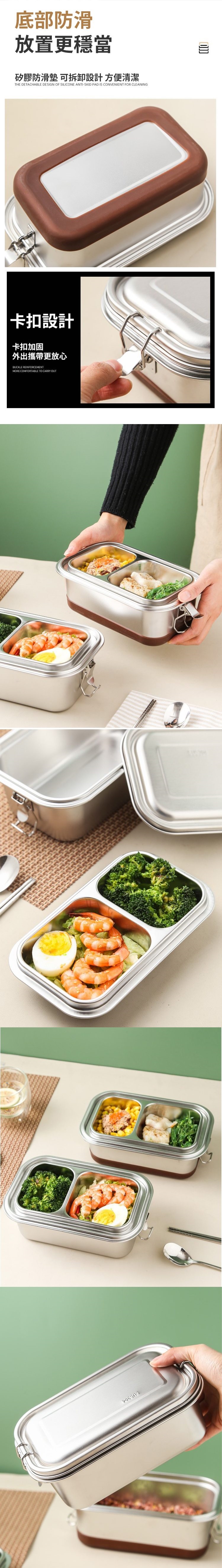 優質304不鏽鋼材質,雙層分隔設計,更大容量,飯菜分離,保留原味不串味,輕鬆享美食,底層矽膠設計,隔熱又防滑,可拆洗,密封防溢蓋設計,防止湯汁不外漏,卡扣設計,不易彈開,外出攜帶更安心