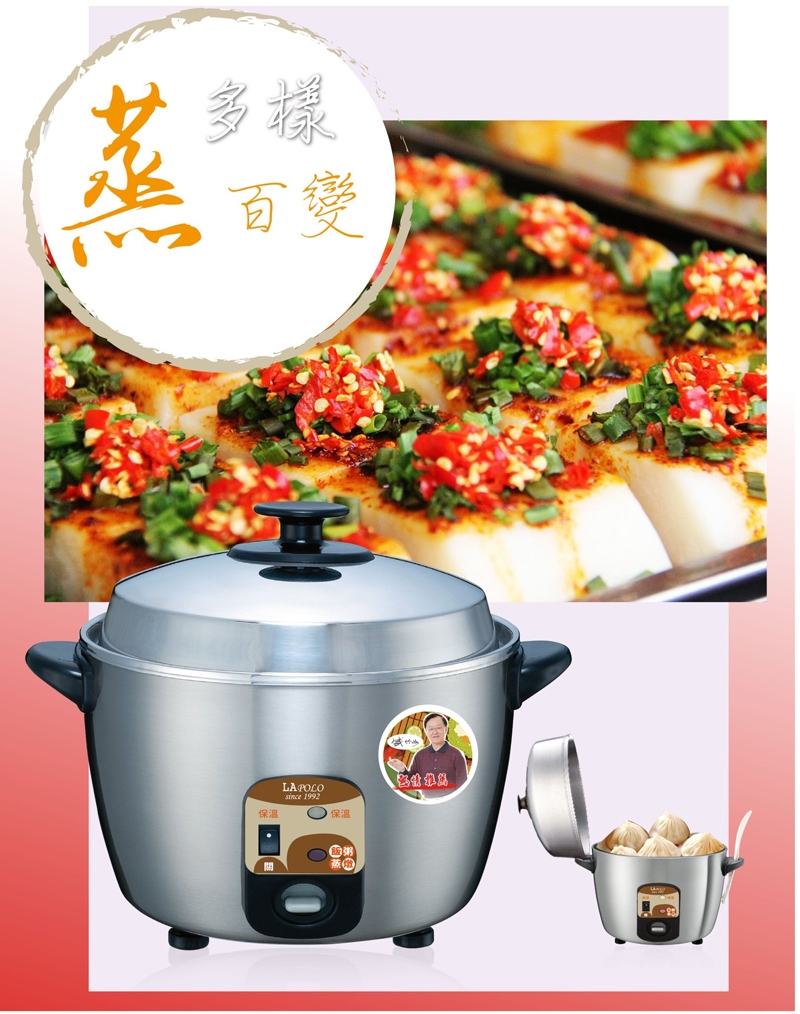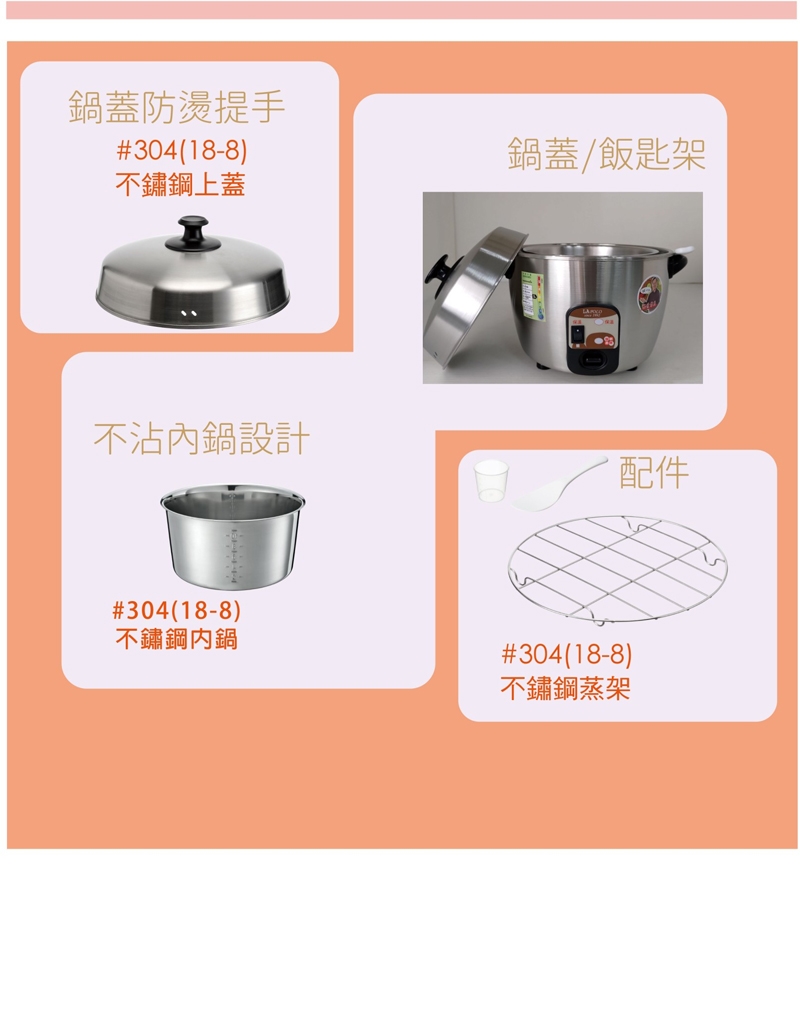 ◆ 電鍋上蓋、內鍋、中鍋(放水加熱的部分)、電鍋外殼、蒸架皆為不鏽鋼製品