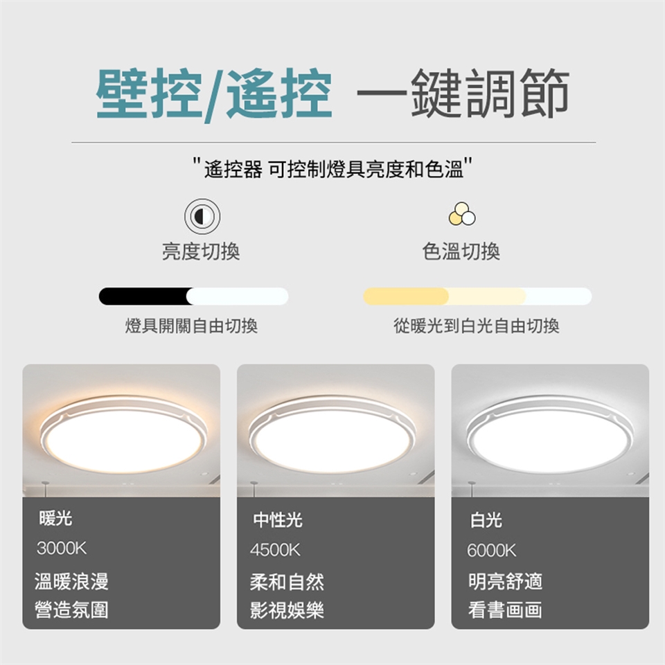 無極調光可使用遙控器控制燈光的亮度和光色(可從不亮慢慢調到最亮,從白光慢慢調到暖光)