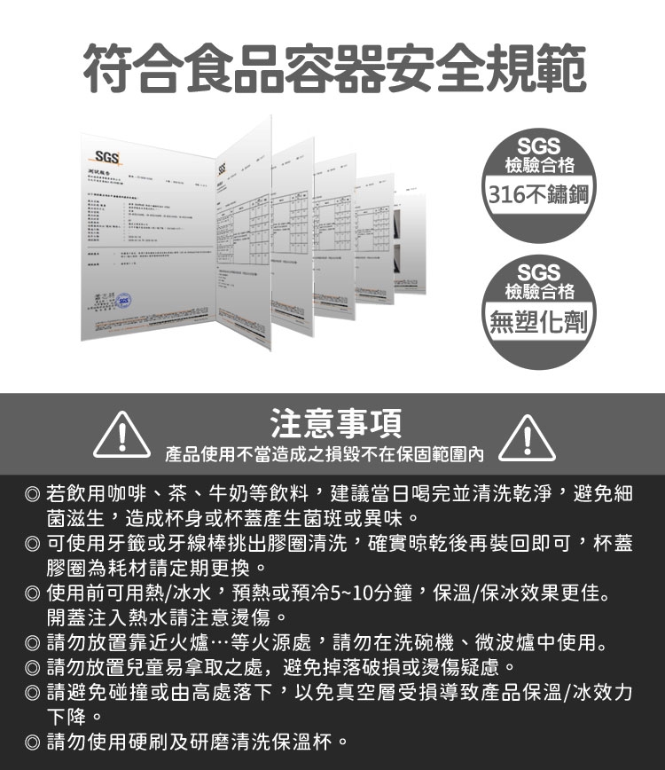 ※若飲用咖啡、茶、牛奶等飲料,建議當日喝完並清洗乾淨,避免細菌滋生,造成杯身或杯蓋產生菌斑或異味。