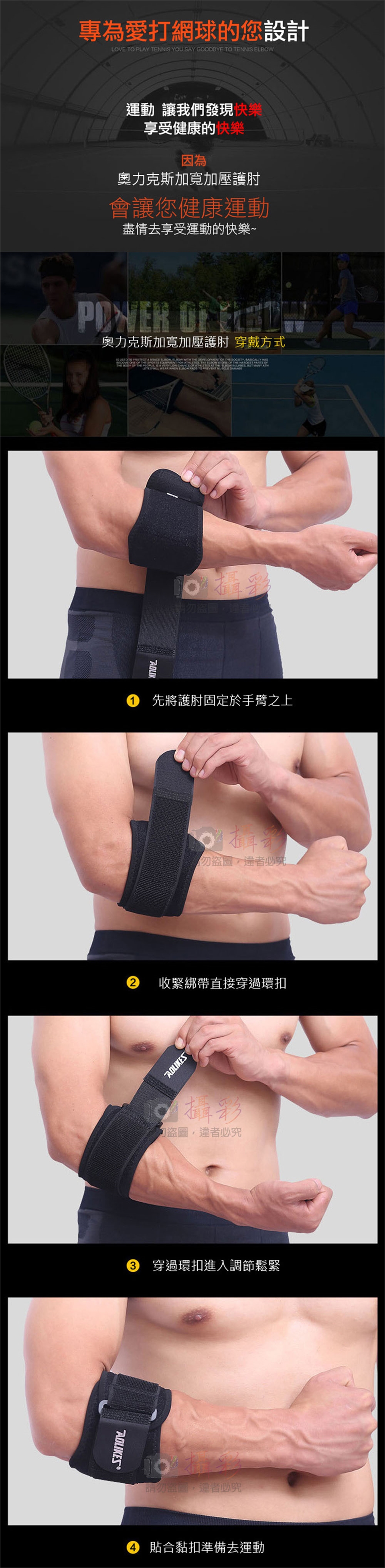 使用方法:先將護肘固定於手臂之上,收緊綁帶直接穿過環扣調節鬆緊,貼合黏扣準備去運動