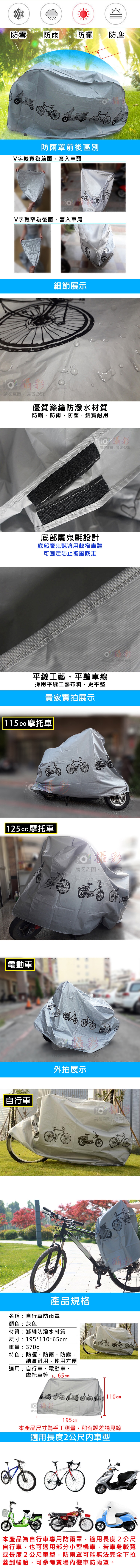本產品為自行車專用防雨罩,適用長度2公尺自行車,也可適用部分小型機車,若車身較寬或長度2公尺車型,防雨罩可能無法完全下拉蓋到輪胎,可參考賣場內機車防雨罩。
