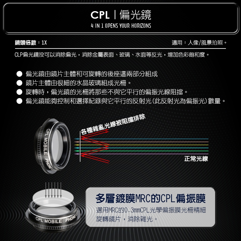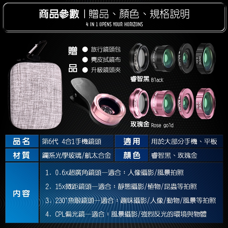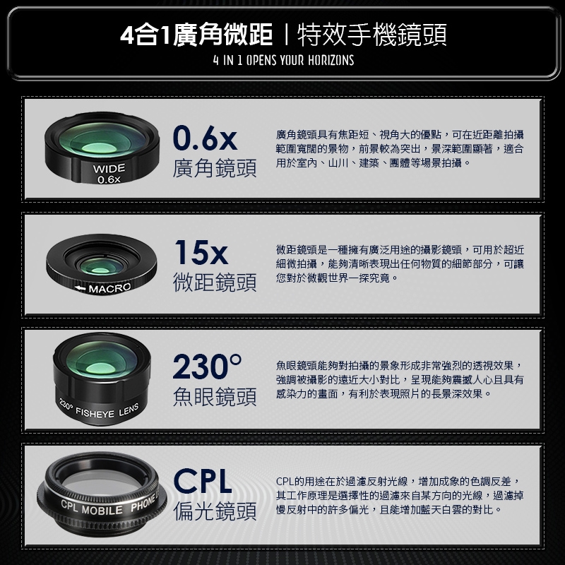 商品名稱:BES 第6代 4合1 廣角/微距/魚眼/偏光特效鏡頭
