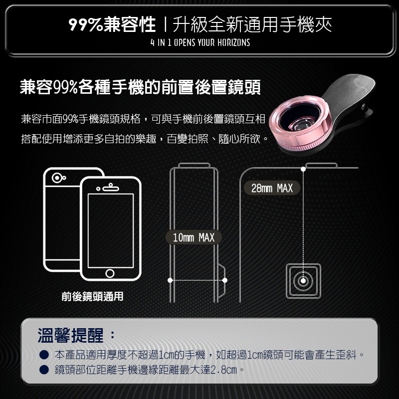 ★高階手機鏡頭越貼進手機鏡頭效果最佳,因為殼的薄厚度都會影響拍攝成像(產生黑邊、暗角、清晰度)建議裸機或薄殼使用。