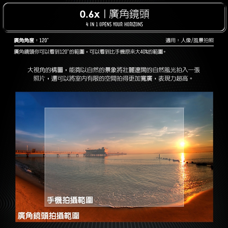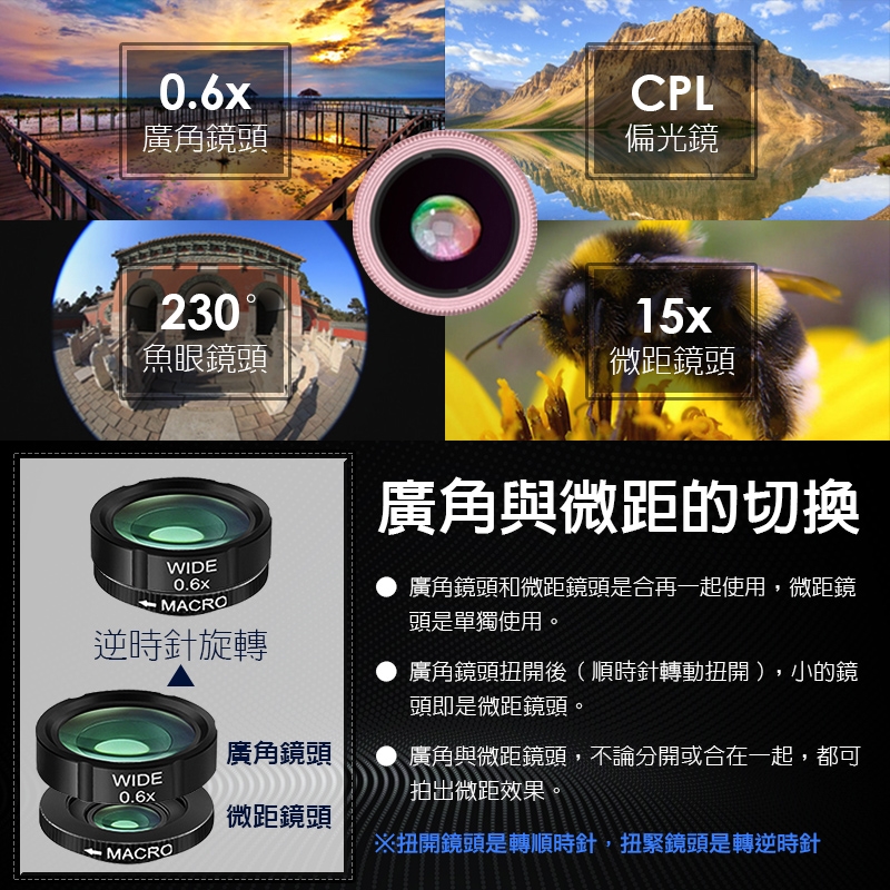 ★廣角鏡頭需與微距鏡頭組合後,才可使用!