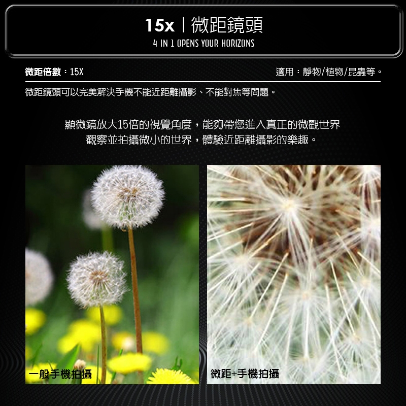 讓手機化身為顯微鏡,專用於近距離拍攝,為小的動植物細節清晰可見,拍攝距離約1.5~3cm,讓您可以發現平時沒有留意的小世界唷~