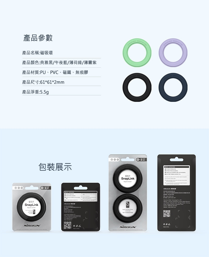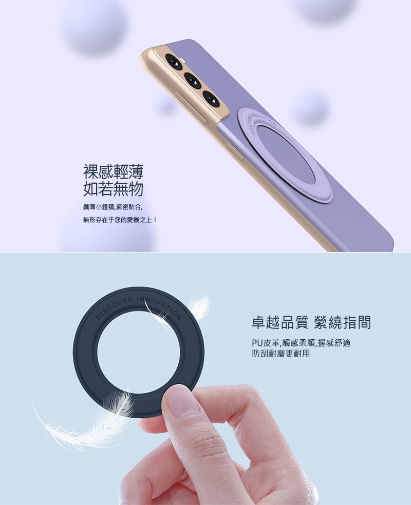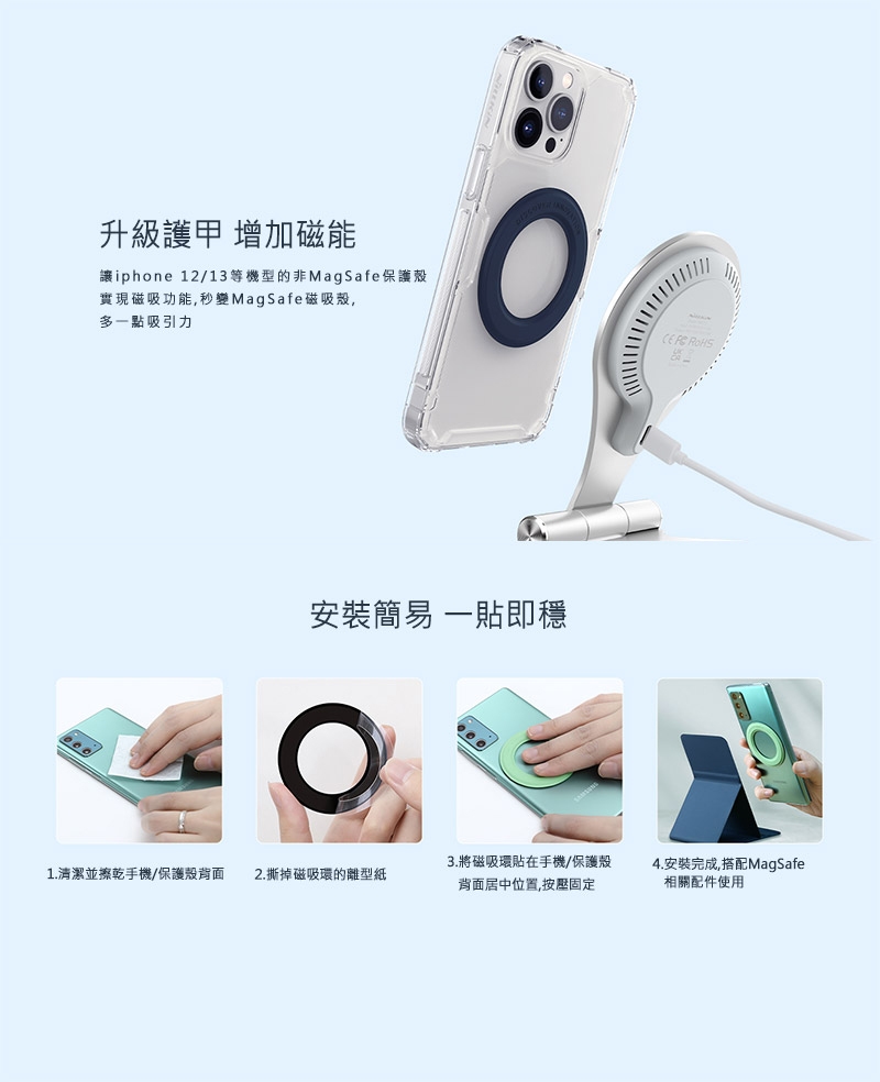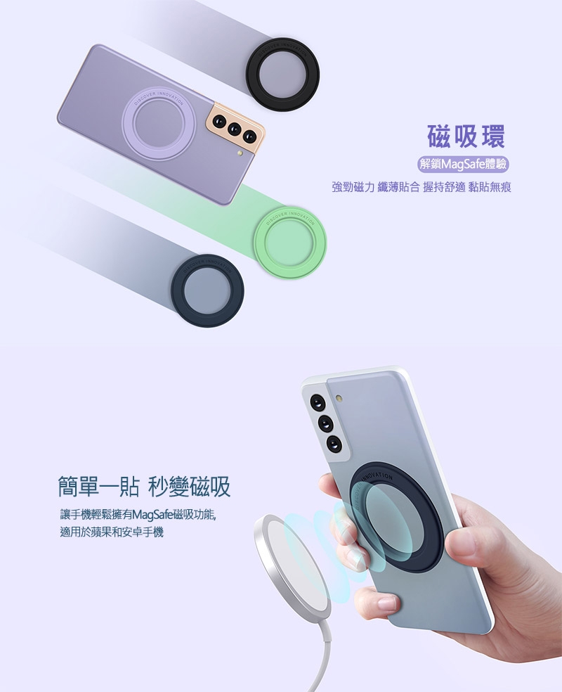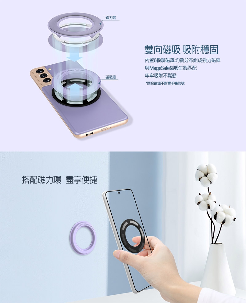 .磁吸環,可以輕鬆讓手機擁有MagSafe磁吸功能,可搭配MagSafe無線充電器及相關磁吸配件使用,廣泛相容蘋果和安卓手機