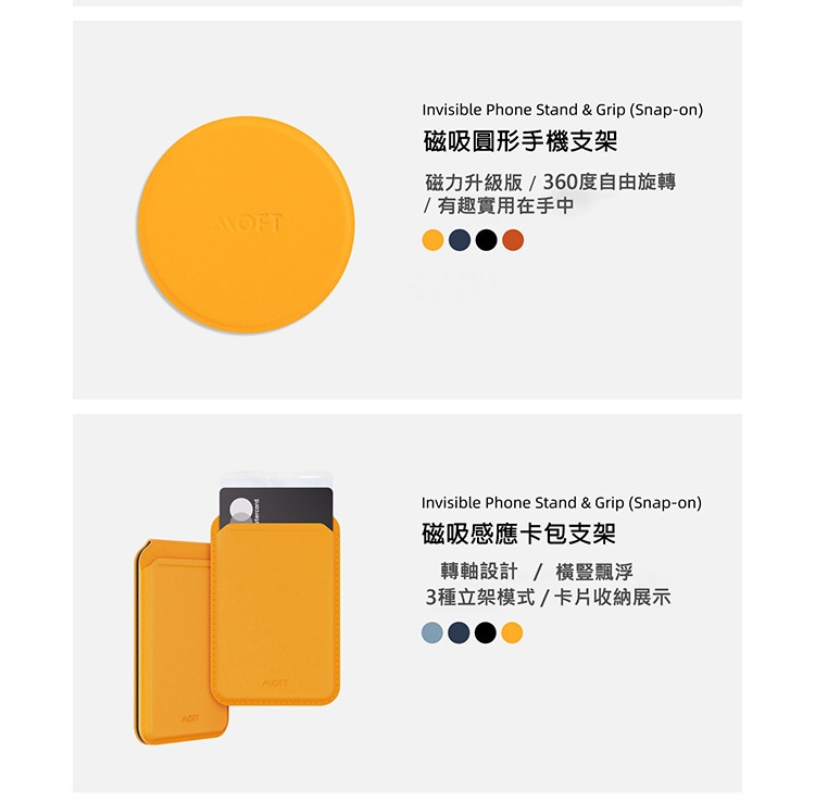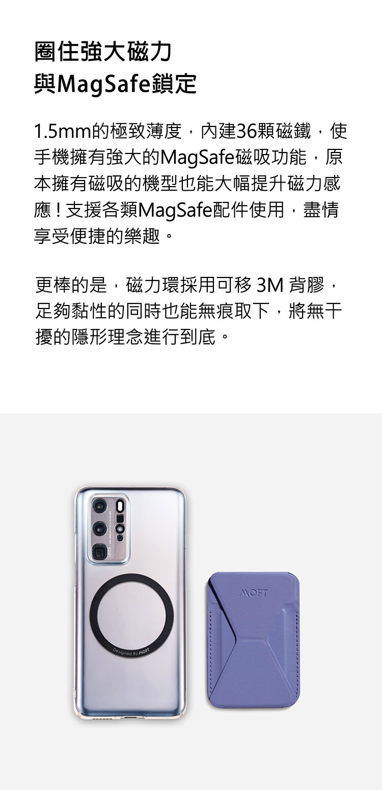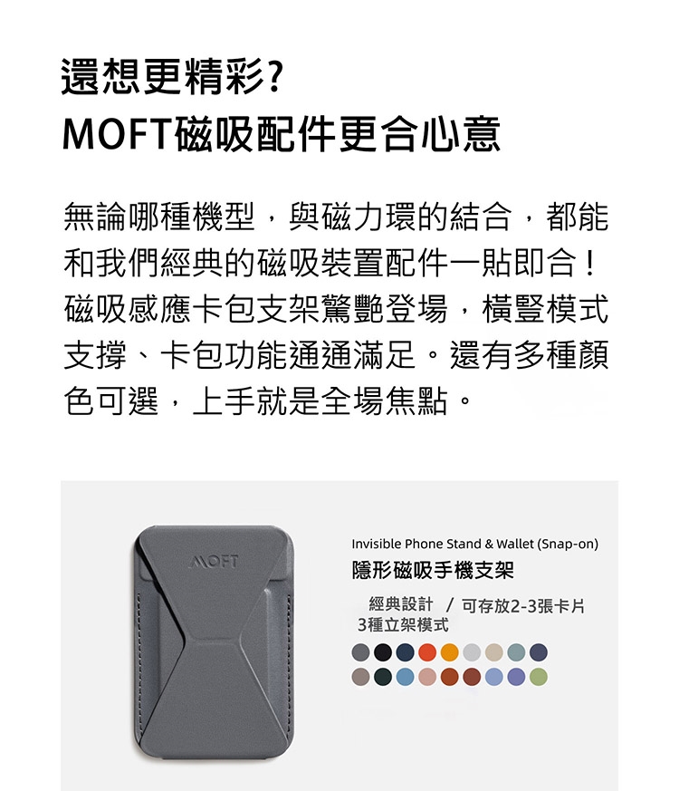 *MOFT O、磁吸式手機支架、磁吸感應卡包支架 與 市面的MagSafe配件均可搭配使用。