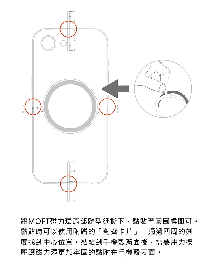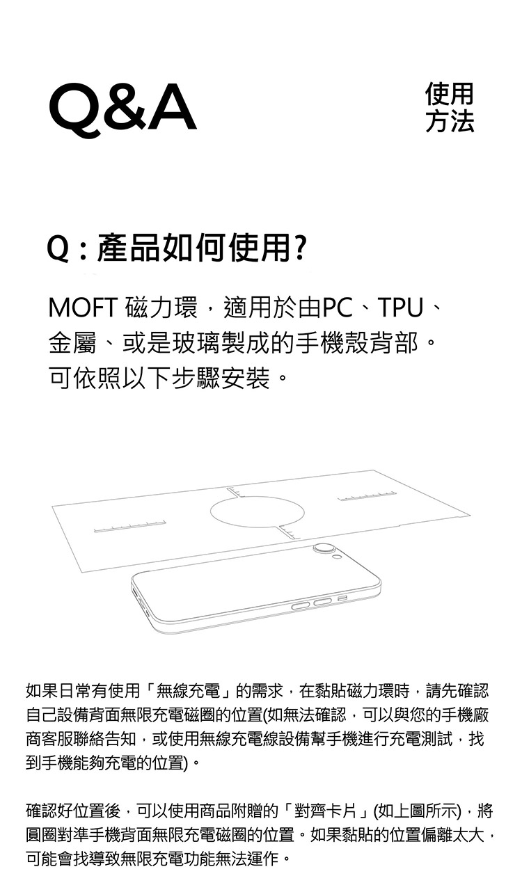 如日常有無線充電需求,請先確認自己設備背面無線充電磁圈的位置,對好位置(可使用附贈的對齊卡片)後,黏貼上去即可。