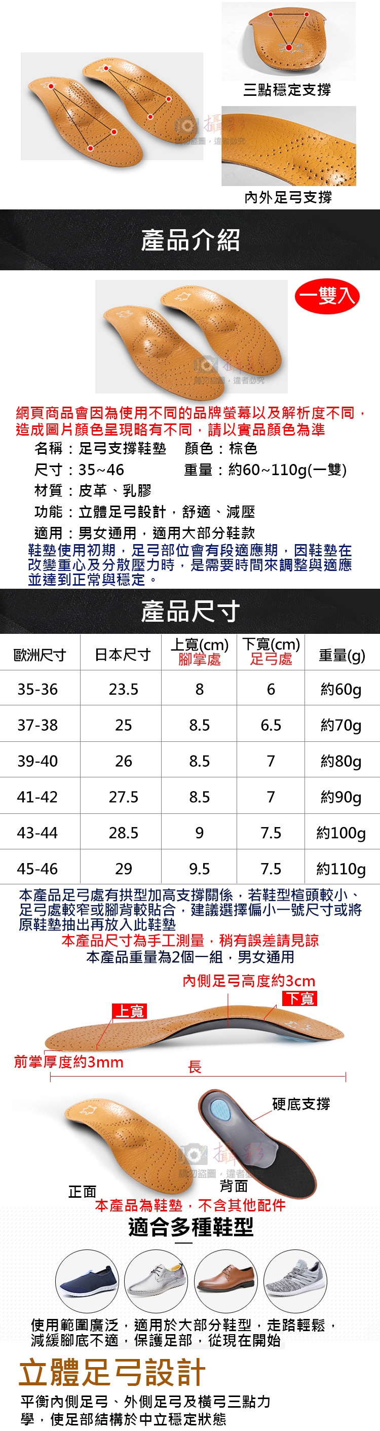 1.本產品根據鞋型不同,若楦頭較小或足弓處較窄,建議選擇偏小一號尺寸