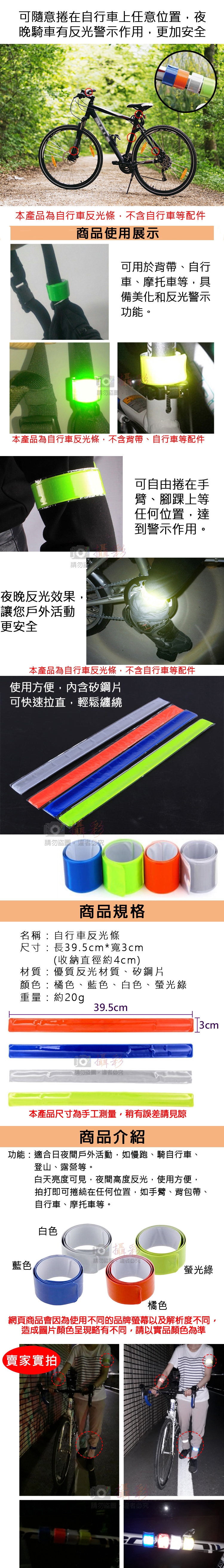 適合夜間戶外活動,如慢跑、騎自行車、登山、露營等。夜間高度反光,白天亮度可見。使用方便,拍打即可捲繞在任何位置。如手臂、背包帶、自行車、摩托車等。