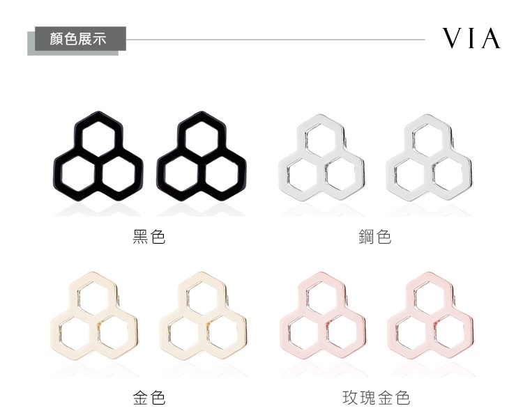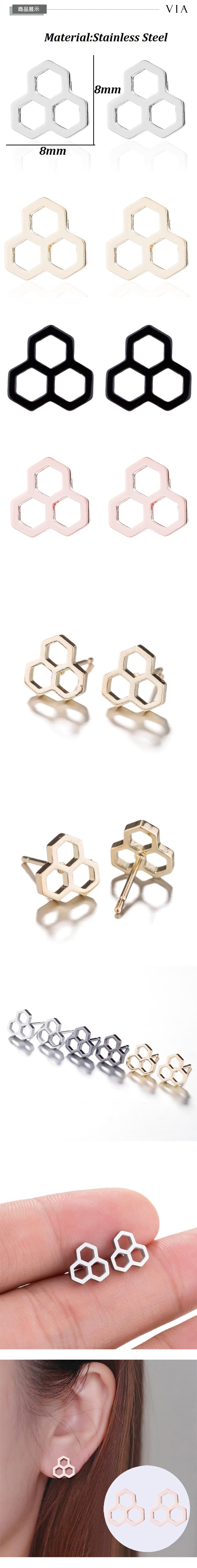 【VIA】符號系列 縷空六角形線條造型白鋼耳釘 造型耳釘 黑色