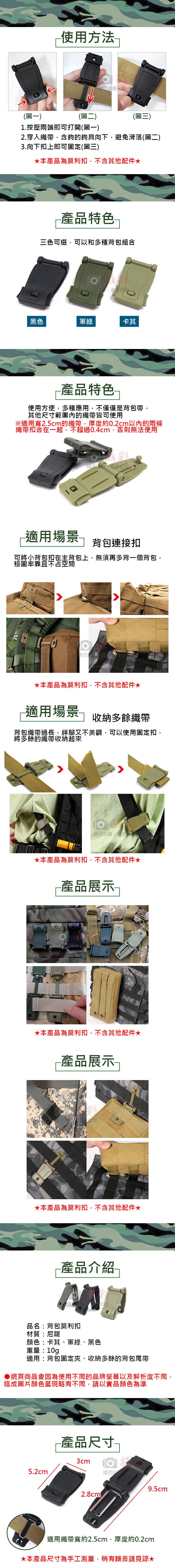 適用寬2.5cm的織帶,厚度約0.2cm以內的兩條織帶扣合在一起,不超過0.4cm,否則會因太厚而無法扣合