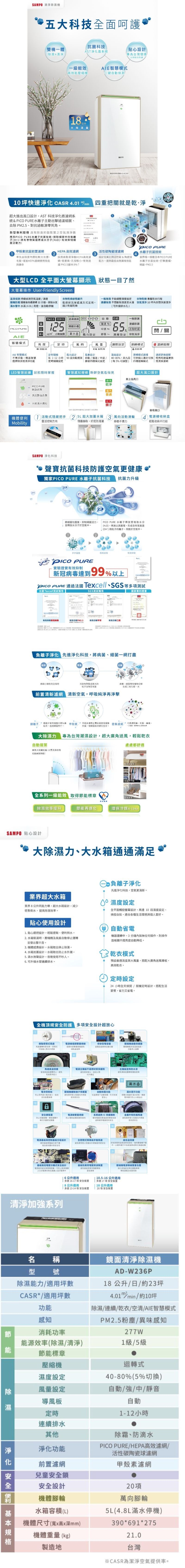 SAMPO聲寶 18公升PICO PURE清淨除濕機 AD-W236P