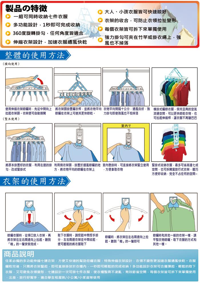 1.利用側衣架頭,掛置於便於晾曬的地方,將衣物平均的晾曬在衣架上。