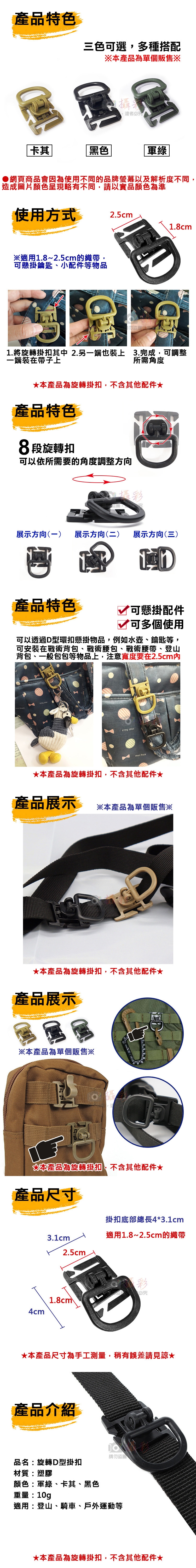 特色:可安裝在戰術背包、戰術腰包、戰術腰帶、登山包、一般包包等物品上,注意寬度要在2.5cm內