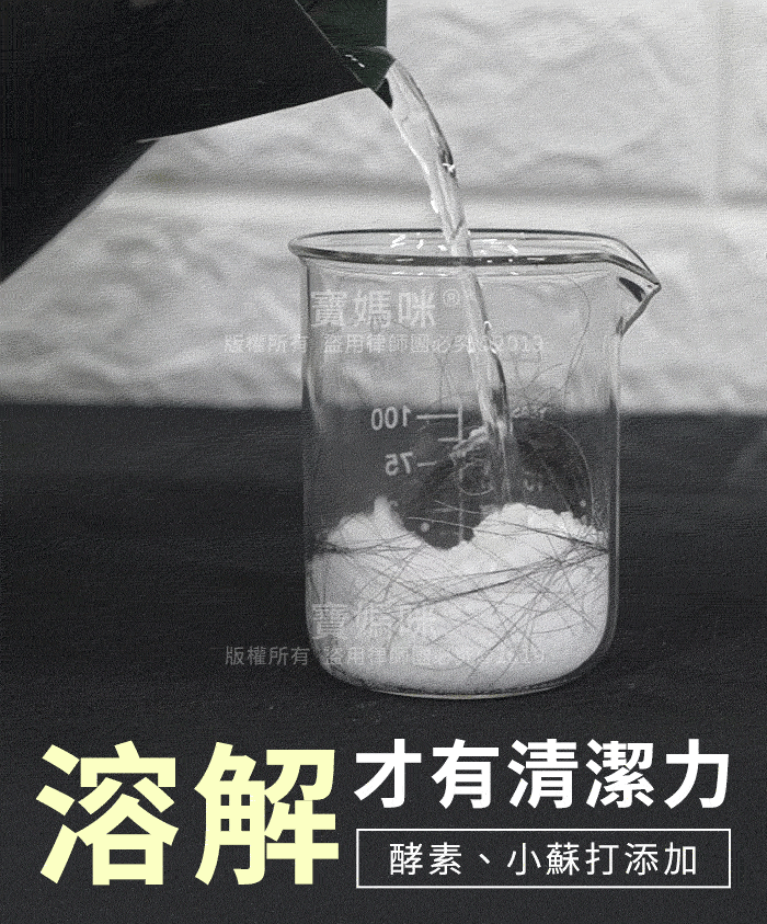 4.如遇較頑強髒污、污漬,倒入粉末後可倒入約50°C熱水,讓清潔效果更佳。