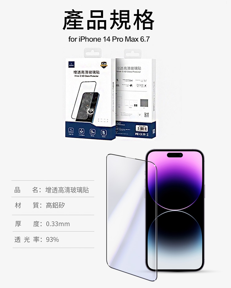 WiWU for iPhone 14 Pro Max 6.7 增透高清系列滿版玻璃貼