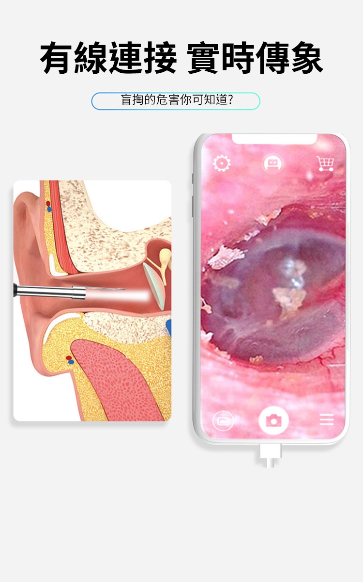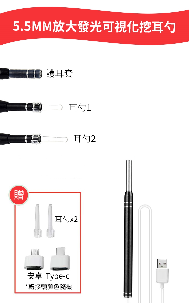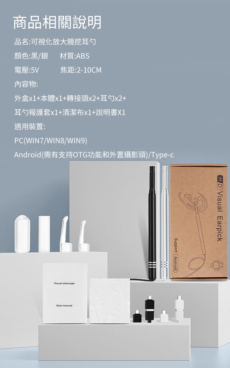 內容物:外盒x1+本體x1+轉接頭x2+耳勺x2+-耳勺報護套x1+清潔布x1+說明書X1