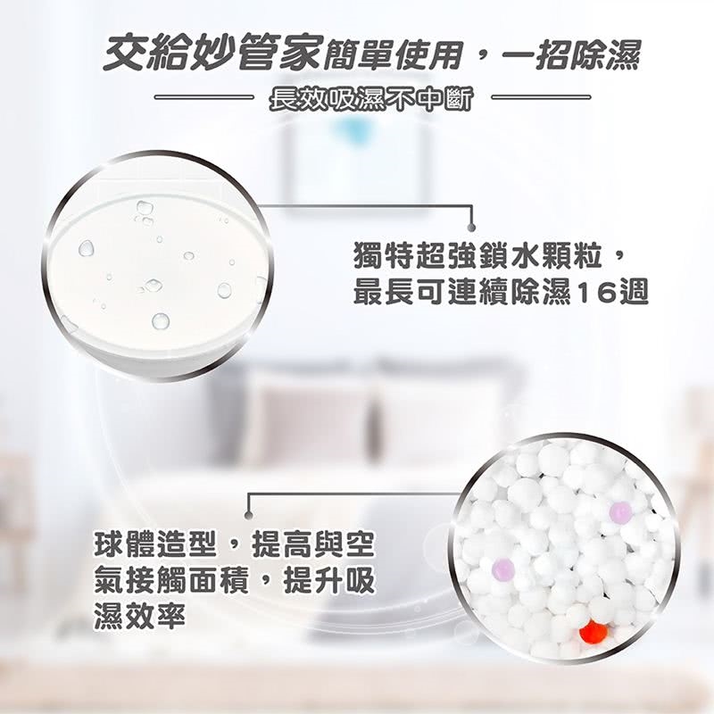 全新長效除濕粒子,常保空間潔淨乾爽,造型簡約輕巧,可放置於各區域、狹窄角落,除濕無死角。