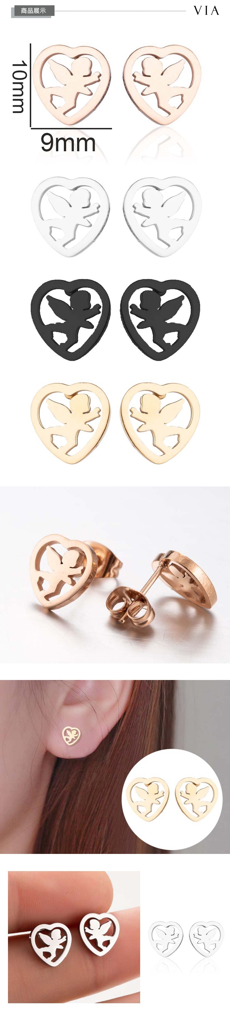 【VIA】時尚系列 愛心縷空線條邱比特造型白鋼耳釘 造型耳釘 玫瑰金色
